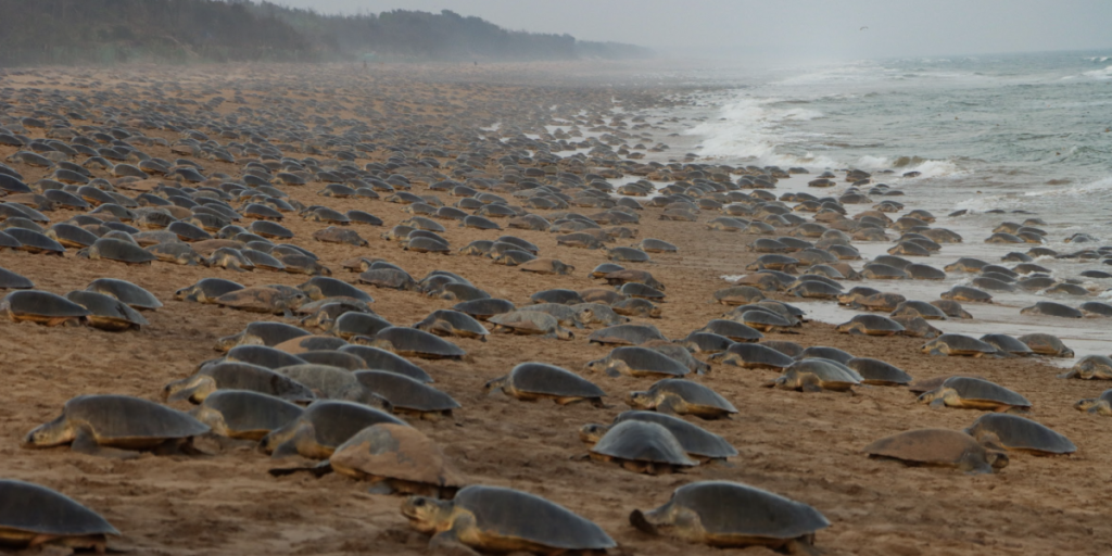 “In every slow paddle, the turtle writes resilience upon the water “ – this is a great saying on one of nature’s marvellous creatures. As dusk descends over Bay of Bengal, millions of Olive ridley turtle hatchlings , erupt from the sand, and guided by the moon light, make a frantic, tiny –flippered dash for the waves. This is one of the most spectacular natural phenomenon. And before this journey of tiny hatchings towards the sea, there is reunion of hundreds of thousands of mother olive ridleys along the shore , which emerges from the surf simultaneously. The Arribada is a marvellous biological event. It begins with the arrival of mother sea turtles, from thousands of miles apart, and they navigate to the exact beach, where they born. They don’t just arrive, they wait off the Eastern coast of India; gathering in shallows, waiting for the perfect time. Triggered by several environmental and biological factors such as the lunar phase, tidal cycles, temperature, rainfall and pheromones, when the moment is right, they swarm in. The oceans seem to be filled with olive green shells, and the beach sand appears replaced by a moving pavement of mother turtles. For a few nights, the beach belongs to this tiny sea creatures for mass nesting.